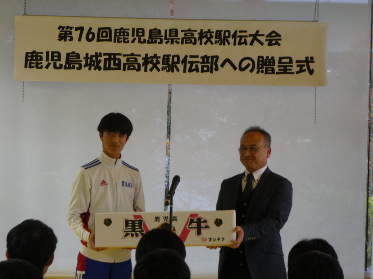 11月に行われた鹿児島県高校駅伝競走大会 男子の部にて2年ぶり3回目の栄冠に輝いた鹿児島県城西高校駅伝部の皆さんに、エールを込めてブランド牛黒乙女55の焼肉8キロ分を贈呈させていただきました!